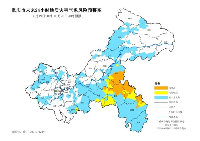 6月19日16時,重慶市規劃和自然資源局、重慶市氣象局聯合發布全市地質災害氣象風險預警。