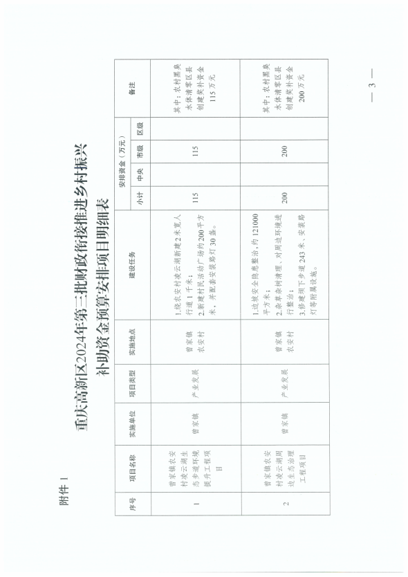 附件:1.重慶高新區2024年第三批財政銜接推進鄉村振興補助資金預算安排項目明細表